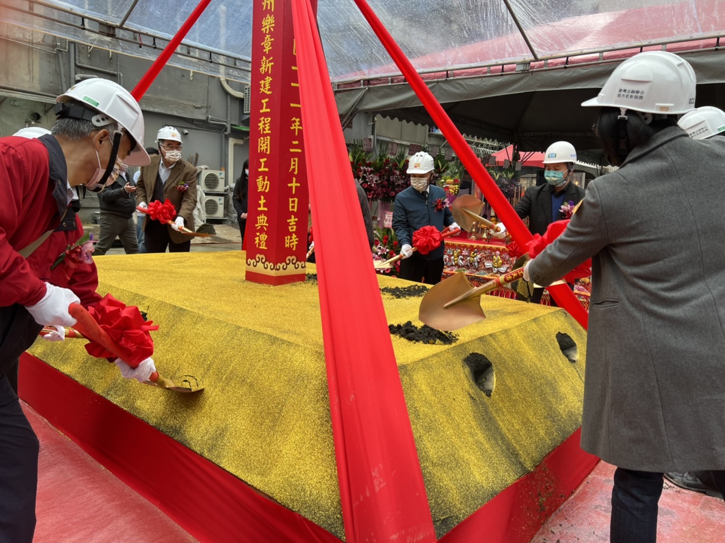 公股挺都更危老再添一樁,由政府政策性成立的泛公股事業「臺灣金融聯合都市更新服務公司」協助地主以自地自建方式進行危老重建的台北市中正區金門街「紀州樂章」案,在今天(10日)由地主、金融都更公司、華南銀行、營造廠樹盛公司、建築師等共同舉行開工動土儀式。